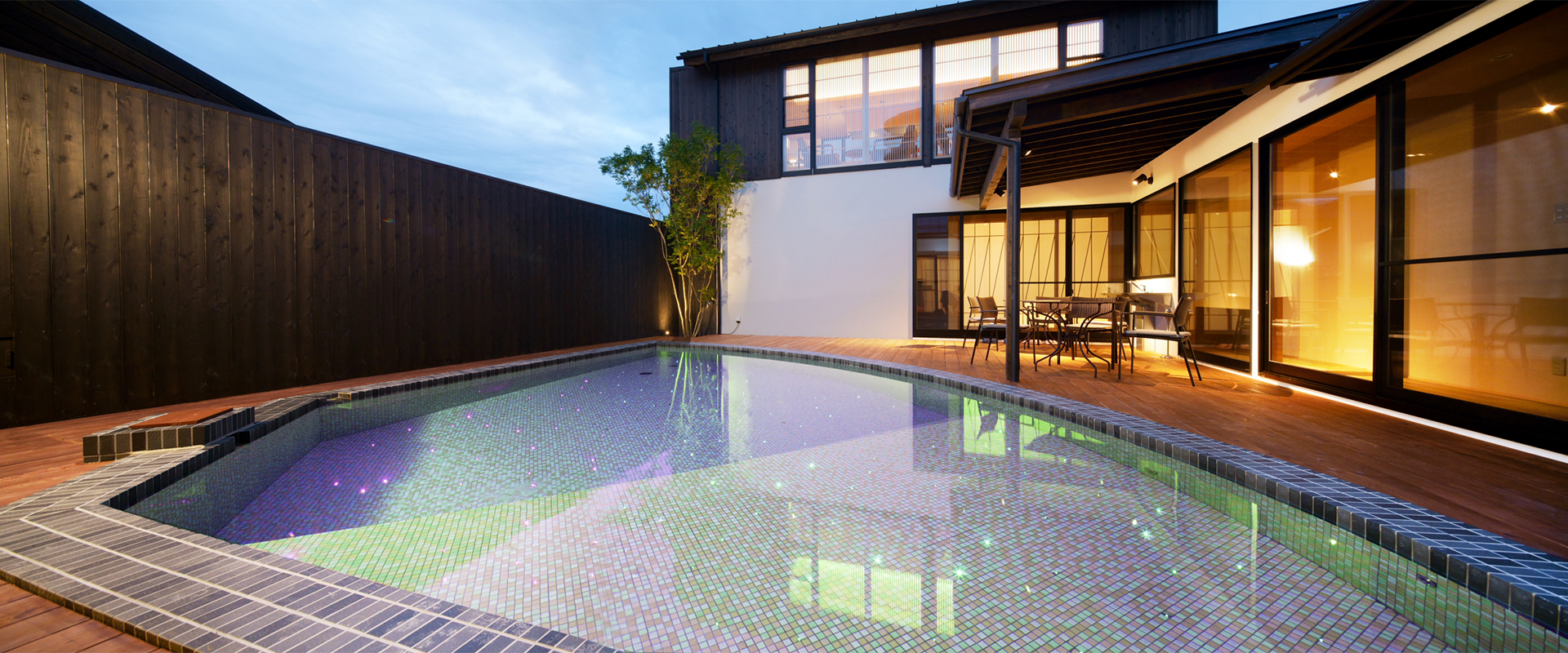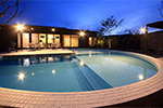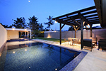 Embedded underwater lighting illuminates the pool, creating a beautiful, glowing water surface that shimmers like an illuminated basin at night.