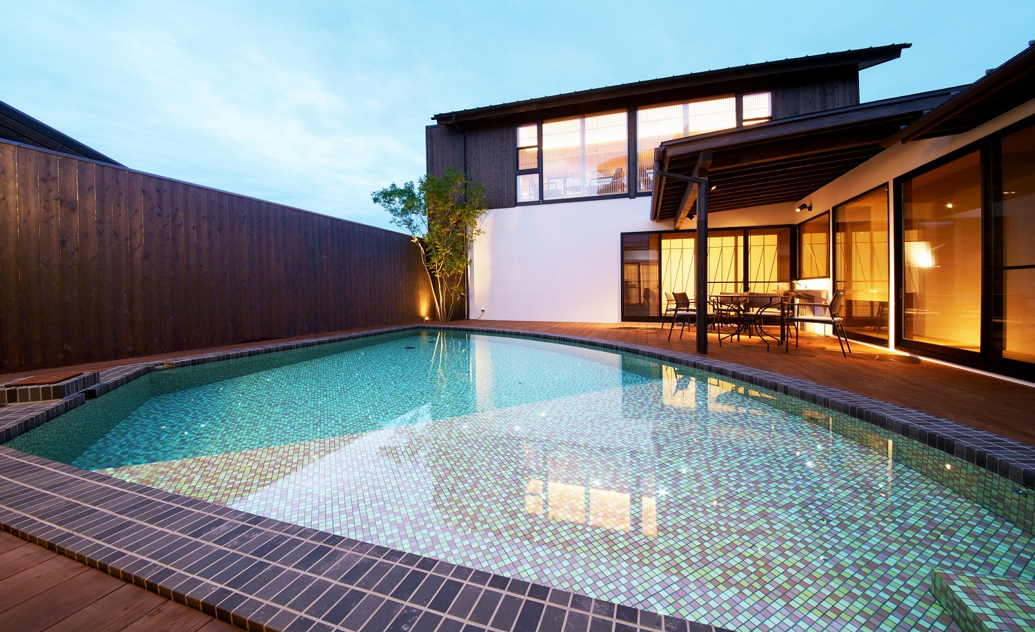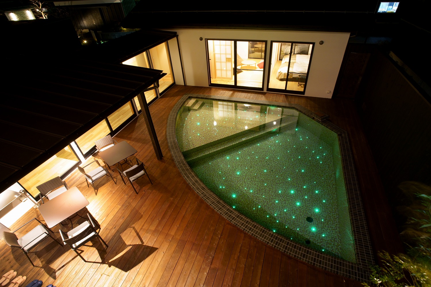 Underwater lighting is embedded in the pool, creating a magical illuminated atmosphere that can be enjoyed year-round.