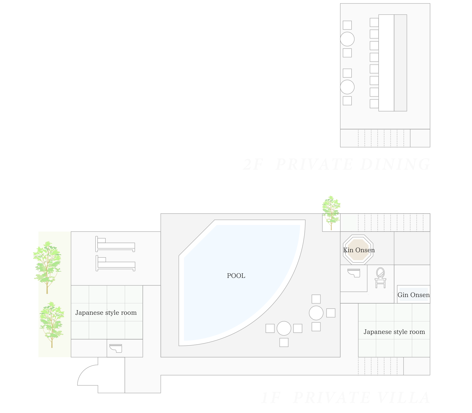 Each room features two rare types of natural hot springs—Kin Onsen (“Gold Hot Spring”) and Gin Onsen (“Silver Hot Spring”)—allowing you to relax in soothing waters anytime you wish.