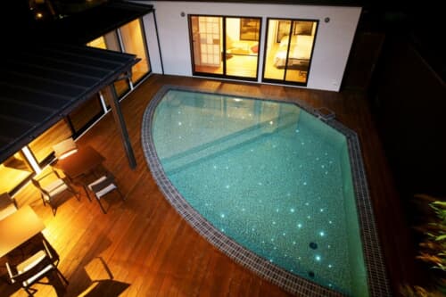 Underwater lighting is embedded in the pool, creating a magical illuminated atmosphere that can be enjoyed year-round.