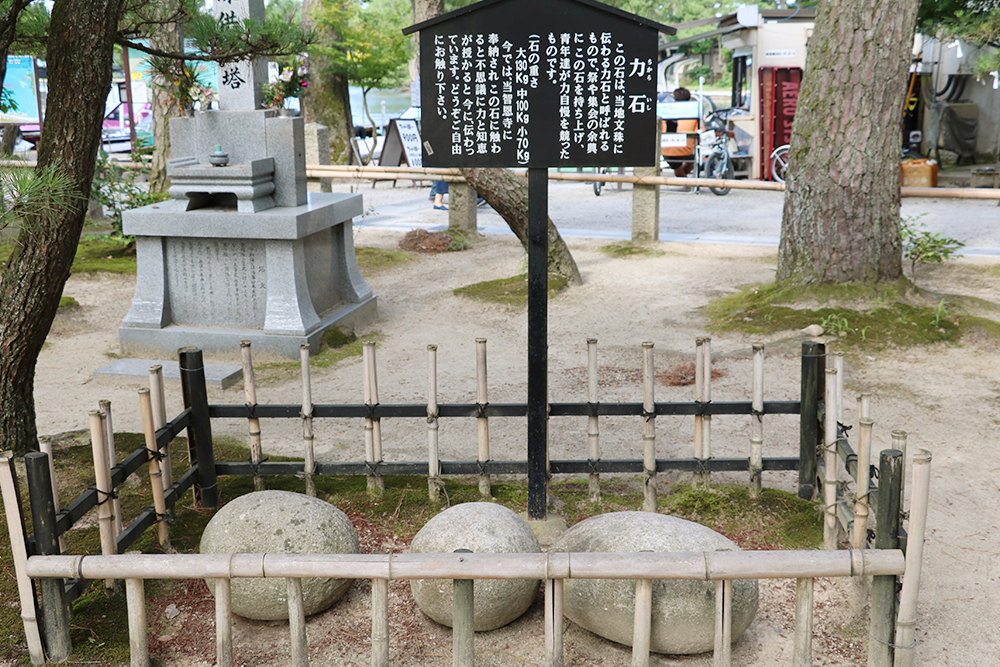 Lined up in a row are three Chikara-ishi, or power stones (large, medium, and small), once used in strength contests by young men during temple festivals.