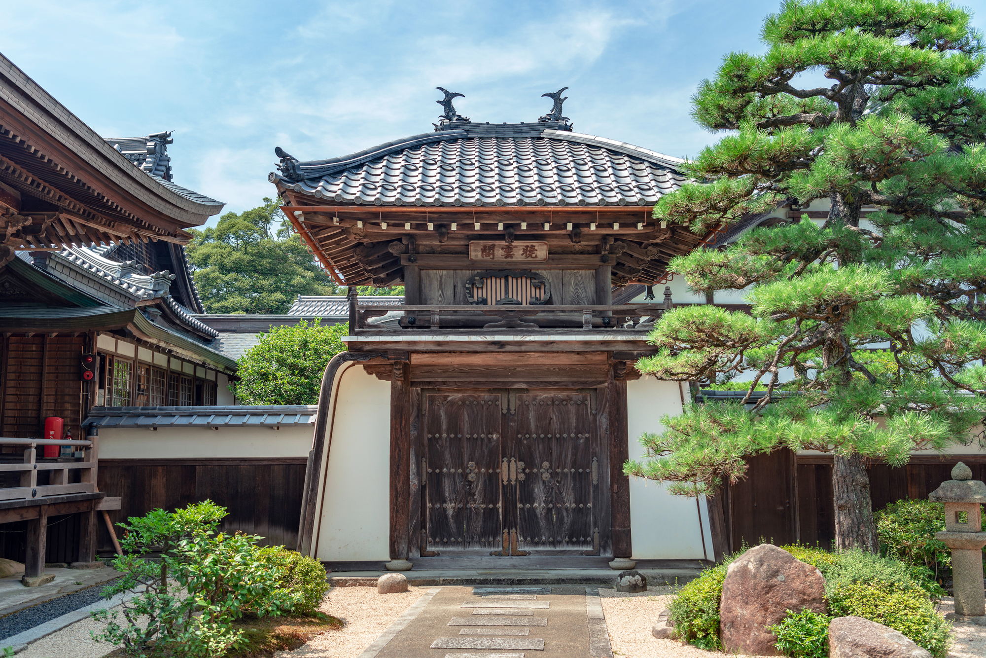 It is said that the name derives from the posthumous Buddhist names of his two deceased children. The structure is notable for its elegant Ryugu-style gate, with turtle-shaped bases on both sides of the lower level.